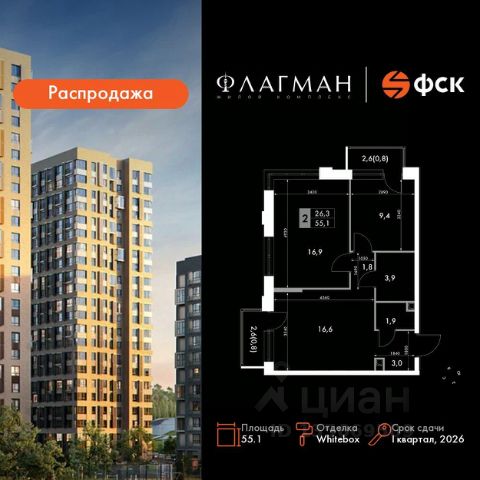 Прямая продажа от застройщика! Жилой Комплекс комфорт-класса. Продаётся 3-к квартира номер 603 общей площадью 55.1 кв.м. на 9-м этаже 12 этажного здания. Отделка Whitebox. Цена с учётом скидки. Особенности квартиры: - Угловая планировка - больше пространства для ваших идей. - Угловое остекление - свет и воздушность в каждой комнате. - Гостевой санузел - комфорт и удобство для ваших гостей. - Евроформат - просторное и удобное жилье с отличной планировкой. - Просторная кухня - место для семейных ужинов и кулинарных экспериментов. - Балкон - открытое пространство для отдыха. Квартира с предчистовой отделкой (White box). Вам не придется заниматься черновыми и трудоёмкими работы, а чистовую отделку и дизайн - сделайте на свой вкус. Информация о комплексе: "Флагман" - современный жилой комплекс для тех, кто ценит комфорт, эстетику и личное пространство. Корпуса, выполненные в едином архитектурном коде, создают выразительный силуэт и формируют гармоничное городское пространство. Современная архитектура от одного из ведущих бюро страны сочетает лаконичность форм и внимание к деталям. Приватные дворы, озеленённые улицы и продуманная инфраструктура делают жизнь здесь по-настоящему комфортной.Благодаря удобному расположению и транспортной доступности, вы легко доберётесь в любую часть города. Транспортная доступность: - 9 мин. пешком до детского сада - 7 мин. до школы - 5 мин. до взрослой поликлиники - 1 мин. до автобусной остановки Внутренняя инфраструктура: Каждая деталь продумана для вашего удобства. Для прогулок и отдыха предусмотрен ландшафтный парк и пешеходный бульвар. Закрытые дворы оснащены детскими и спортивными площадками, а в каждом доме предусмотрены кладовые и колясочные. Комфортные гостевые зоны и зоны ожидания создают атмосферу уюта уже с первых шагов в дом. Все корпуса имеют удобный вход без ступеней и пандусов, обеспечивая лёгкий доступ для жителей любого возраста. Для автомобилистов предусмотрен одноэтажный паркинг с автоматической мойкой, а на первых этажах расположены коммерческие помещения, обеспечивающие повседневные потребности жителей.