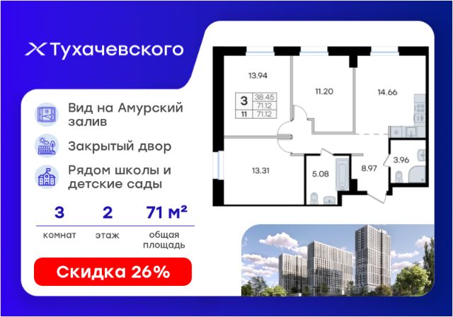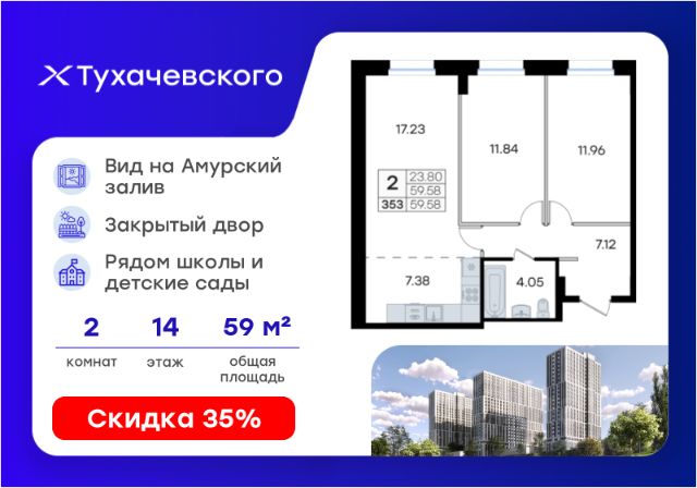 Продаётся 4-комнатная квартира в сданном доме (Дом 2), срок сдачи: II-кв. 2024, общей площадью 99.94 кв.м., на 23 этаже. Жилой комплекс "Лидер" представляет собой комплексную многоэтажную застройку. Застройщиком спроектированы квартиры с различными планировками: от одно до четырехкомнатных. Благоустройство прилегающей территории включает в себя строительство детской площадки, а также зон отдыха. Предусмотрены открытые гостевые парковки. В шаговой доступности находятся детские сады, школы, медицинские учреждения, аптеки, магазины.