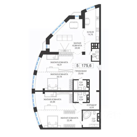 Продаётся 5-комнатная квартира в строящемся доме (Дом 1), срок сдачи: IV-кв. 2025, общей площадью 175.6 кв.м., на 14 этаже. ЖК представляет собой футуристический архитектурный ансамбль, состоящий из двух башен высотой 24 этажа и монументальной стилобатной части, на 5 этажах которой будут располагаться парковочная зона, а также современный торговый центр. Несмотря на слегка дерзкий вид башен, стремительно взмывающих вверх, они прекрасным образом гармонируют с окружающим пространством: солнечные лучи, играющие на зеркальной поверхности фасада, и отражающиеся на ней облака создают фантастический пространственный эффект! Высота наземной части зданий составляет 75 м., общая площадь насчитывает около 40 000 кв. м. - всё это 399 апартаментов свободной планировки, площадью от 97 до 200 кв. м. 192 апартамента. Обязательным условием при проектировании комплекса стало использование высококачественных современных технологий и материалов, проверенных не только мировыми лидерами в области строительства, но и лично нами в ходе реализации других проектов: - Технология муфтовых соединений арматуры каркаса - Стоечно-ригельные фасады SCHUECO - Использование альтернативных источников энергии для освещения территории благоустройства комплекса, а также мест общего пользования - Электронная система вентиляции и кондиционирования