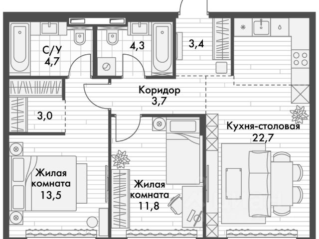 внушительный выбор функциональных и просторных планировочных решений, предусматривающих возможность самостоятельного зонирования площади и реализации любых дизайнерских решений в соответствии с индивидуальными потребностями семьи, доступны варианты недвижимости с 2 санузлами;