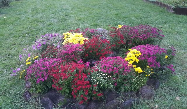 Вишня молодая. Клумба с цветами у террасы радует глаз.