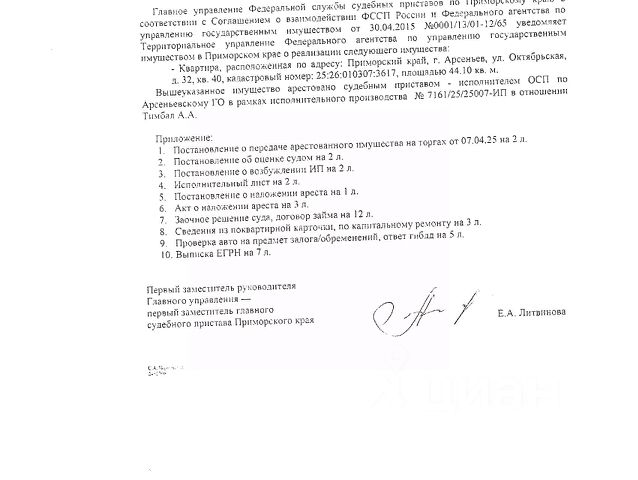 Данные получены с сайта ГИС Торги. Жилое помещение (квартира) площадью 44,10 кв.м., кадастровый номер 25:26:010307:3617, расположенное по адресу: Приморский край, г. Арсеньев, ул. Октябрьская, д. 32, кв. 40. Вид права - собственность, сведения о правах и ограничениях (обременениях): 4 записи о запрещении регистрации, арест, ипотека в силу закона от 24.07.2017, по адресу зарегистрирован 1 чел., задолженность по взносам на кап.ремонт по состоянию на 28.11.2025г составляет 20683,80 руб., а также пени в размере 5546,19 руб. Продается квартира до 2,8 млн. рублей в Арсеньеве.