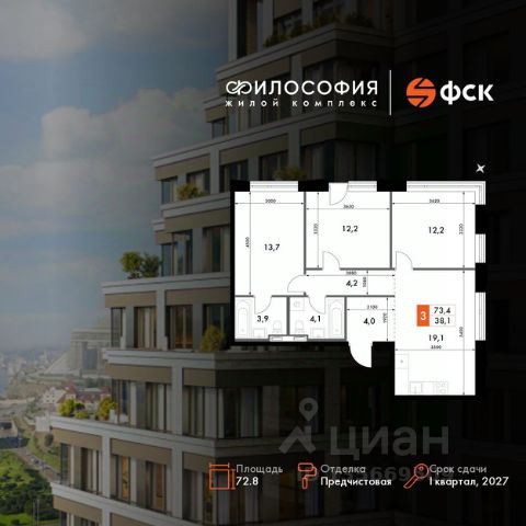 Прямая продажа от застройщика! Жилой Комплекс бизнес-класса. Продаётся 3-к квартира номер 414 общей площадью 72.8 кв.м. на 5-м этаже 10 этажного здания. Предчистовая отделка. Цена с учётом скидки. Особенности квартиры: - Мастер-зона с санузлом. Уют и комфорт в одном пространстве. - Угловая планировка - больше пространства для ваших идей. - Панорамное окно (1 и более) - раскрывает просторы вашего дома. - Угловое остекление - свет и воздушность в каждой комнате. - Кухня-гостиная - идеальное пространство для встреч с близкими. Квартира с предчистовой отделкой. Вам не придется заниматься черновыми и трудоёмкими работы, а чистовую отделку и дизайн - сделайте на свой вкус. Информация о комплексе: В самом центре Владивостока рождается "Философия" - жилой комплекс бизнес-класса, вдохновлённый идеей гармонии. Семь тематических зданий складываются в единое произведение архитектуры, где каждая деталь продумана для вашего комфорта, вдохновения и покоя. Транспортная доступность: - 15 мин. пешком до Пушкинского театра и музейно-театрального центра на Орлиной сопке - 15 мин. пешком до Набережной Цесаревича - 5-10 мин. на машине до парка Минного городка -