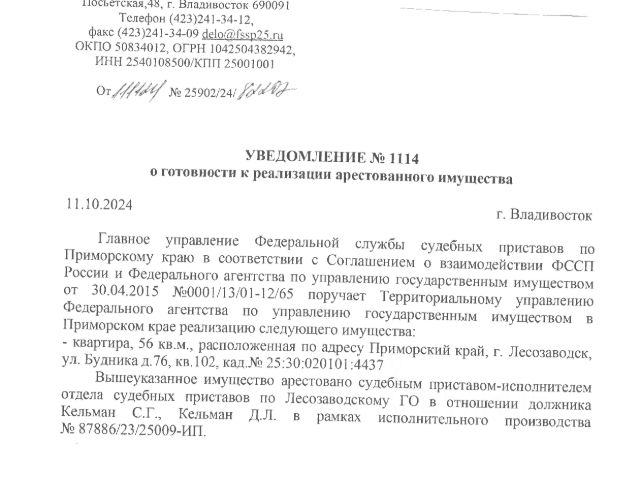Данные получены с сайта ГИС Торги. Жилое помещение (2-х комнатная квартира) площадью 56 кв.м., в том числе жилой 28,4 кв.м., кадастровый номер 25:30:020101:4437, расположенное по адресу: Приморский край, г. Лесозаводск, ул. Будника, д. 76, кв. 102, вид права - общая долевая собственность, сведения о правах и ограничениях (обременениях): 9 записей о запрещении регистрации, ипотека в силу закона от 21.11.2008, 3 записи о прочих ограничениях прав и обременениях объекта недвижимости, по адресу зарегистрировано 2 чел., задолженность по взносам на кап.ремонт, а также пеням отсутствует.