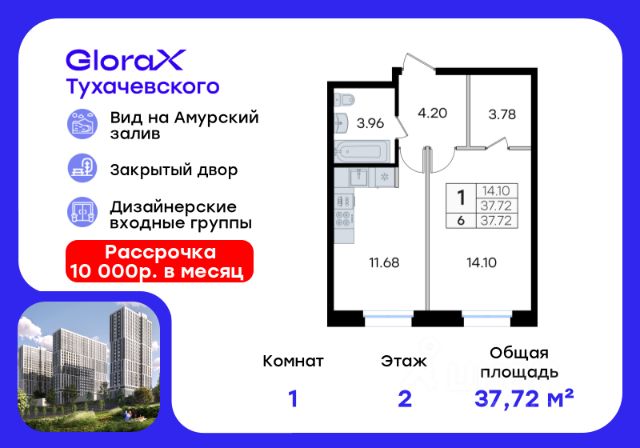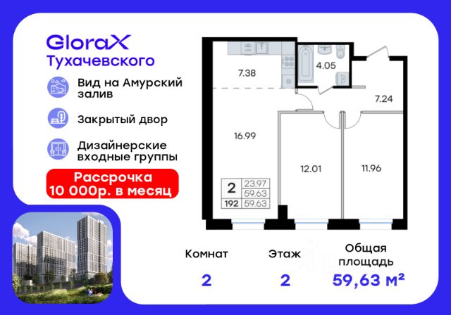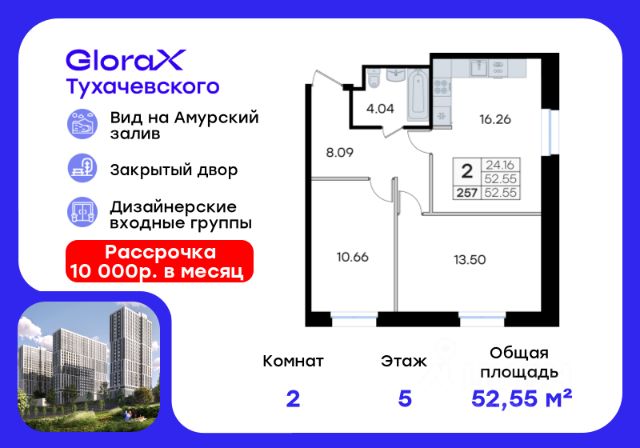 Продается 1-комн. квартира на 2-м этаже в жилом комплексе GloraX Тухачевского — современном проекте нового формата в престижном районе Владивостока. Общая площадь лота составляет 36,68 кв. м, из которых 14,10 кв. м отведено под жилую и 11,68 кв. м под кухонную зону. Номер квартиры - 229. Преимущества квартиры: однокомнатная квартира; гардеробная. Преимущества проекта: • Панорамный вид на Амурский залив и зелёные сопки • Удачное расположение и транспортная доступность: Первореченский район, 20 минут до центра города • Закрытая охраняемая территория с доступом только для жителей • Эксклюзивное благоустройство: продуманное зонирование, игровые и спортивные площадки, арт-инсталляция, Тайный сад • Безбарьерная среда, видеонаблюдений, Wi-Fi на территории • Премиальный дизайн входных групп реcепшн и лаунж-зоной • Лапомойки, колясочные и туалеты на первом этаже • Подземный паркинг на 449 машиномест с доступом на лифте с жилых этажей • Индивидуальные кладовые на цокольном этаже от 2 до 10 м2 GloraX Тухачевского — это городское пространство нового формата, которое позволяет современным горожанам находить все необходимые атрибуты комфортной жизни внутри своего жилого комплекса. Весь комплекс спроектирован так, чтобы жить здесь было удобно и безопасно: светлые лаунж-зоны и ресепшн на входах в жилые корпуса, эксклюзивный дизайн мест общего пользования и придомовой территории, круглосуточная охрана, видеонаблюдение и даже детский сад в одном из корпусов все, что необходимо современному городскому жителю. GloraX Тухачевского находится в одном из самых престижных районов города с хорошей, давно сформировавшейся инфраструктурой и отличной транспортной доступностью. Отсюда легко добраться до центра города, других районов и даже пригорода как на собственном транспорте, так и на общественном. Квартал имеет прямой выезд на ул. Тухачевского, а рядом с комплексом расположена автобусная остановка на несколько маршрутов. Проект состоит из 3 монолитных корпусов, объединенных единым стилобатом. В комплексе предусмотрены: подземный паркинг с лифтом на жилые этажи, кладовые для хранения, благоустроенный двор без машин, детские и спортивные площадки, зоны для отдыха и прогулок. Эксклюзивный проект благоустройства территории разработан одной из лучших студий ландшафтного дизайна DEREVOPARK с фокусом на комфорт и удобство для всех жителей комплекса. Вся необходимая инфраструктура — магазины, школы, детские сады, остановки общественного транспорта — находится рядом. Узнайте подробности и подберите свою квартиру в GloraX Тухачевского — в отделе продаж уже сегодня. Цена указана при 100% оплате или стандартной ипотеке. Узнайте подробности в Отделе продаж.