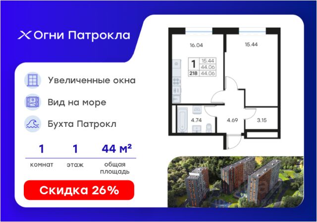 Продается 1-комн. квартира на 1-м этаже в проекте Огни Патрокла от GloraX. Огни Патрокла - уникальный видовой проект с выделяющейся архитектурой в развитом районе Владивостока. Общая площадь лота составляет 44,06 кв. м, из которых 15,44 кв. м отведено под жилую и 16,04 кв. м под кухонную зону. Номер квартиры - 218.