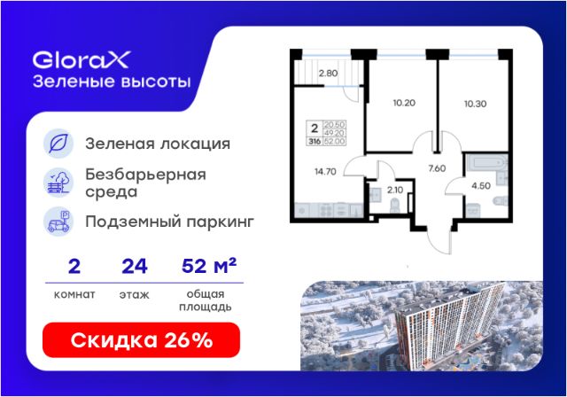 Продается 2-комн. квартира на 24-м этаже в жилом квартале GloraX Зелёные высоты — проекте в тихой зелёной локации. Общая площадь квартиры 52,00 кв. м, из которых 20,50 кв. м включая 20,50 кв. м жилого пространства и 14,70 кв. м кухни. Номер квартиры - 316. Преимущества квартиры: компактная евро-3; лоджия. Преимущества проекта: • Идеальное сочетание городской и загородной жизни • Сдаем в 2026 году • Уютный зелёный район с развитой инфраструктурой • Великолепные виды на Вечнозеленый сквер и лесопарк на 150 Га • Видеонаблюдение, IP-домофон, Wi-Fi на территории, • Дизайнерские входные группы • Безбарьерная среда, колясочные, туалеты на 1 этаже, лапомойки • Эксклюзивное благоустройство территории • Подземный паркинг на 235 машино-мест с лифтом на жилые этажи • Индивидуальные кладовые от 3 до 7 кв. м • Черновая отделка для реализации любых дизайнерских идей GloraX Зелёные высоты — современный жилой проект, сочетающий преимущества городской и пригородной жизни. Комплекс тщательно продуман для максимального удобства и обеспечения безопасности жителей. Квартал расположен в зеленом, живописном и активно развивающемся районе Зеленый Угол, вдали от серой массовой застройки. Жители GloraX Зелёные высоты смогут насладждаться прогулками в Вечнозелёном сквере или лесопарке. В непосредственной близости находятся остановки общественного транспорта и автомобильный подъезд со стороны Нейбута. Скоро также появится выездом на трассу Де-Фриз-Седанка, что обеспечит быстрый доступ в любую часть города и пригород. Проект включает 2 корпуса, каждый из которых спроектирован с акцентом на комфорт, безопасность и современный образ жизни. В комплексе предусмотрен подземный паркинг на 235 машиномест с доступом прямо с жилых этажей. Паркинг оборудован современными системами видеонаблюдения, контроля въезда-выезда и пожаротушения. Цокольный этаж здания отведен под индивидуальные кладовые площадью от 3 до 7 квадратных метров, которые можно использовать для хранения сезонных вещей. Доступ к кладовым - на лифте с жилых этажей. Территория жилого квартала благоустроена и включает игровые зоны и спортивные площадки для детей различных возрастных групп, уютные зоны отдыха со скамейками и универсальную воркаут-площадку для активного досуга. В шаговой доступности располагаются все необходимые объекты социальной инфраструктуры. Узнайте больше в отделе продаж — выберите свою квартиру в GloraX Зелёные высоты уже сегодня!