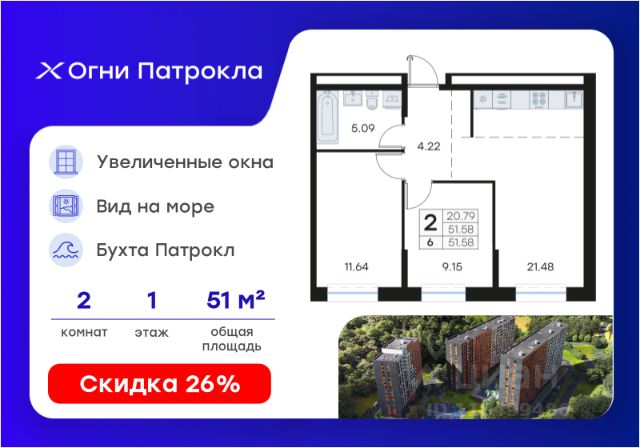 • Квартиры с панорамными видами на бухту Патрокл, маяк Басаргина и остров Русский