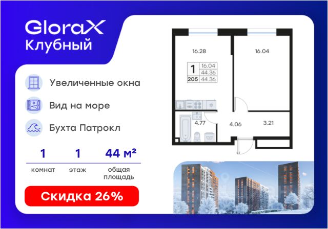 Продается 2-комн. квартира на 1-м этаже в квартале GloraX Клубный. GloraX Клубный - уникальный видовой проект с выделяющейся архитектурой в развитом районе Владивостока. Общая площадь лота составляет 46,19 кв. м, из которых 23,66 кв. м отведено под жилую и 12,09 кв. м под кухонную зону. Номер квартиры - 197.