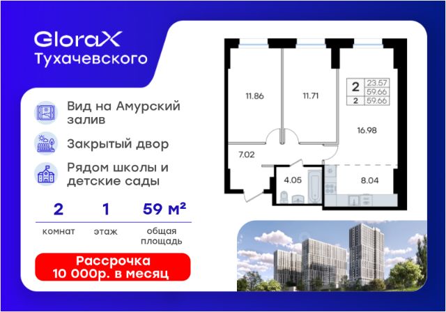 Продается 3-комн. квартира на 1-м этаже в жилом комплексе GloraX Тухачевского — современном проекте нового формата в престижном районе Владивостока. Общая площадь лота составляет 62,81 кв. м, из которых 33,17 кв. м отведено под жилую и 13,84 кв. м под кухонную зону. Номер квартиры - 184. Преимущества квартиры: трехкомнатная квартира; угловая; 2 санузла. Преимущества проекта: • Панорамный вид на Амурский залив и зелёные сопки • Удачное расположение и транспортная доступность: Первореченский район, 20 минут до центра города • Закрытая охраняемая территория с доступом только для жителей • Эксклюзивное благоустройство: продуманное зонирование, игровые и спортивные площадки, арт-инсталляция, Тайный сад • Безбарьерная среда, видеонаблюдений, Wi-Fi на территории • Премиальный дизайн входных групп реcепшн и лаунж-зоной • Лапомойки, колясочные и туалеты на первом этаже • Подземный паркинг на 449 машиномест с доступом на лифте с жилых этажей • Индивидуальные кладовые на цокольном этаже от 2 до 10 м2 GloraX Тухачевского — это городское пространство нового формата, которое позволяет современным горожанам находить все необходимые атрибуты комфортной жизни внутри своего жилого комплекса. Весь комплекс спроектирован так, чтобы жить здесь было удобно и безопасно: светлые лаунж-зоны и ресепшн на входах в жилые корпуса, эксклюзивный дизайн мест общего пользования и придомовой территории, круглосуточная охрана, видеонаблюдение и даже детский сад в одном из корпусов все, что необходимо современному городскому жителю. GloraX Тухачевского находится в одном из самых престижных районов города с хорошей, давно сформировавшейся инфраструктурой и отличной транспортной доступностью. Отсюда легко добраться до центра города, других районов и даже пригорода как на собственном транспорте, так и на общественном. Квартал имеет прямой выезд на ул. Тухачевского, а рядом с комплексом расположена автобусная остановка на несколько маршрутов. Проект состоит из 3 монолитных корпусов, объединенных единым стилобатом. В комплексе предусмотрены: подземный паркинг с лифтом на жилые этажи, кладовые для хранения, благоустроенный двор без машин, детские и спортивные площадки, зоны для отдыха и прогулок. Эксклюзивный проект благоустройства территории разработан одной из лучших студий ландшафтного дизайна DEREVOPARK с фокусом на комфорт и удобство для всех жителей комплекса. Вся необходимая инфраструктура — магазины, школы, детские сады, остановки общественного транспорта — находится рядом. Узнайте подробности и подберите свою квартиру в GloraX Тухачевского — в отделе продаж уже сегодня. Цена указана при 100% оплате или стандартной ипотеке. Узнайте подробности в Отделе продаж.