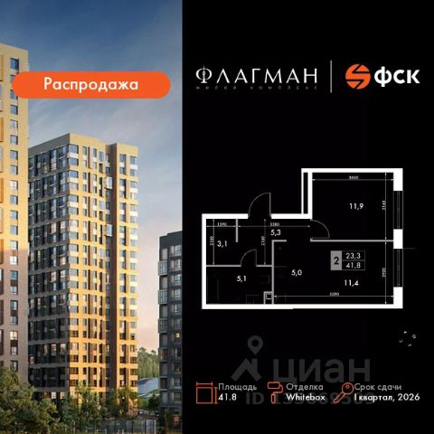 Прямая продажа от застройщика! Жилой Комплекс комфорт-класса. Продаётся 2-к квартира номер 371 общей площадью 41.8 кв.м. на 9-м этаже 22 этажного здания. Отделка Whitebox. Цена с учётом скидки. Особенности квартиры: - Линейная планировка - максимальная функциональность и удобство. - Линейная планировка - максимальная функциональность и удобство. - Просторная ванная - место для расслабления и уединения. - Кухня-гостиная - идеальное пространство для встреч с близкими. - Гардеробная - удобство для хранения и организации вещей. Квартира с предчистовой отделкой (White box). Вам не придется заниматься черновыми и трудоёмкими работы, а чистовую отделку и дизайн - сделайте на свой вкус. Информация о комплексе: "Флагман" - современный жилой комплекс для тех, кто ценит комфорт, эстетику и личное пространство. Корпуса, выполненные в едином архитектурном коде, создают выразительный силуэт и формируют гармоничное городское пространство. Современная архитектура от одного из ведущих бюро страны сочетает лаконичность форм и внимание к деталям. Приватные дворы, озеленённые улицы и продуманная инфраструктура делают жизнь здесь по-настоящему комфортной.Благодаря удобному расположению и транспортной доступности, вы легко доберётесь в любую часть города. Транспортная доступность: - 9 мин. пешком до детского сада - 7 мин. до школы - 5 мин. до взрослой поликлиники - 1 мин. до автобусной остановки Внутренняя инфраструктура: Каждая деталь продумана для вашего удобства. Для прогулок и отдыха предусмотрен ландшафтный парк и пешеходный бульвар. Закрытые дворы оснащены детскими и спортивными площадками, а в каждом доме предусмотрены кладовые и колясочные. Комфортные гостевые зоны и зоны ожидания создают атмосферу уюта уже с первых шагов в дом. Все корпуса имеют удобный вход без ступеней и пандусов, обеспечивая лёгкий доступ для жителей любого возраста. Для автомобилистов предусмотрен одноэтажный паркинг с автоматической мойкой, а на первых этажах расположены коммерческие помещения, обеспечивающие повседневные потребности жителей.