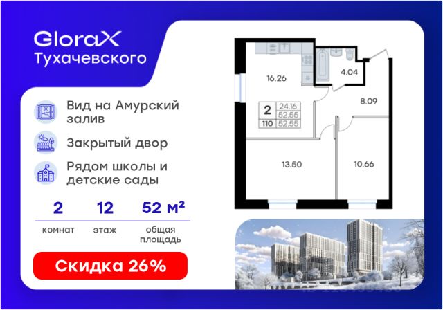 Продается 2-комн. квартира на 12-м этаже в жилом комплексе GloraX Тухачевского — современном проекте нового формата в престижном районе Владивостока. Общая площадь лота составляет 54,37 кв. м, из которых 24,58 кв. м отведено под жилую и 12,60 кв. м под кухонную зону. Номер квартиры - 107.
