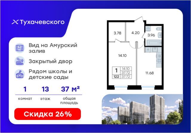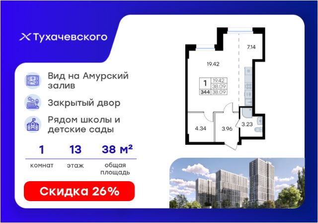 Продается квартира-студия на 13-м этаже в жилом комплексе Тухачевского от GloraX — современном проекте нового формата в престижном районе Владивостока. Общая площадь лота составляет 38,09 кв. м, из которых 19,42 кв. м отведено под жилую и 7,14 кв. м под кухонную зону. Номер квартиры - 344.