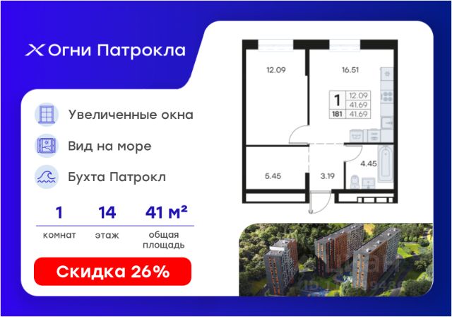 Продается 1-комн. квартира на 14-м этаже в проекте Огни Патрокла от GloraX. Огни Патрокла - уникальный видовой проект с выделяющейся архитектурой в развитом районе Владивостока. Общая площадь лота составляет 32,46 кв. м, из которых 9,65 кв. м отведено под жилую и 11,93 кв. м под кухонную зону. Номер квартиры - 382.