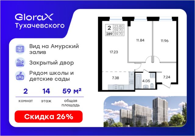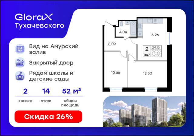 Продается 2-комн. квартира на 14-м этаже в жилом комплексе GloraX Тухачевского — современном проекте нового формата в престижном районе Владивостока. Общая площадь лота составляет 52,55 кв. м, из которых 24,16 кв. м отведено под жилую и 16,26 кв. м под кухонную зону. Номер квартиры - 347. Преимущества квартиры: двухкомнатная квартира; высокий этаж; угловая. Преимущества проекта: • Панорамный вид на Амурский залив и зелёные сопки • Удачное расположение и транспортная доступность: Первореченский район, 20 минут до центра города • Закрытая охраняемая территория с доступом только для жителей • Эксклюзивное благоустройство: продуманное зонирование, игровые и спортивные площадки, арт-инсталляция, Тайный сад • Безбарьерная среда, видеонаблюдений, Wi-Fi на территории • Премиальный дизайн входных групп реcепшн и лаунж-зоной • Лапомойки, колясочные и туалеты на первом этаже • Подземный паркинг на 449 машиномест с доступом на лифте с жилых этажей • Индивидуальные кладовые на цокольном этаже от 2 до 10 м2 GloraX Тухачевского — это городское пространство нового формата, которое позволяет современным горожанам находить все необходимые атрибуты комфортной жизни внутри своего жилого комплекса. Весь комплекс спроектирован так, чтобы жить здесь было удобно и безопасно: светлые лаунж-зоны и ресепшн на входах в жилые корпуса, эксклюзивный дизайн мест общего пользования и придомовой территории, круглосуточная охрана, видеонаблюдение и даже детский сад в одном из корпусов все, что необходимо современному городскому жителю. GloraX Тухачевского находится в одном из самых престижных районов города с хорошей, давно сформировавшейся инфраструктурой и отличной транспортной доступностью. Отсюда легко добраться до центра города, других районов и даже пригорода как на собственном транспорте, так и на общественном. Квартал имеет прямой выезд на ул. Тухачевского, а рядом с комплексом расположена автобусная остановка на несколько маршрутов. Проект состоит из 3 монолитных корпусов, объединенных единым стилобатом. В комплексе предусмотрены: подземный паркинг с лифтом на жилые этажи, кладовые для хранения, благоустроенный двор без машин, детские и спортивные площадки, зоны для отдыха и прогулок. Эксклюзивный проект благоустройства территории разработан одной из лучших студий ландшафтного дизайна DEREVOPARK с фокусом на комфорт и удобство для всех жителей комплекса. Вся необходимая инфраструктура — магазины, школы, детские сады, остановки общественного транспорта — находится рядом. Узнайте подробности и подберите свою квартиру в GloraX Тухачевского — в отделе продаж уже сегодня. Цена указана при 100% оплате или стандартной ипотеке. Узнайте подробности в Отделе продаж.