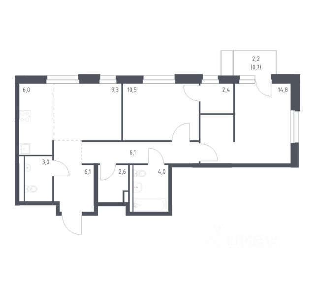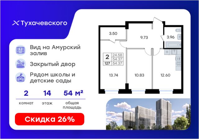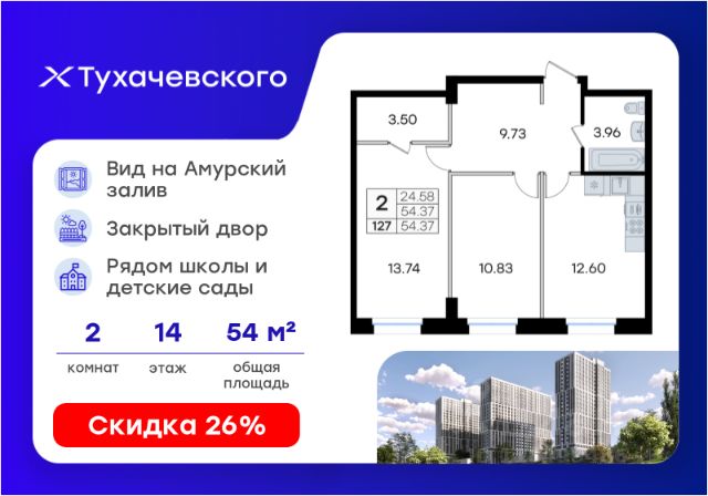 Продается 2-комн. квартира на 14-м этаже в жилом комплексе Тухачевского от GloraX — современном проекте нового формата в престижном районе Владивостока. Общая площадь лота составляет 59,70 кв. м, из которых 23,80 кв. м отведено под жилую и 7,38 кв. м под кухонную зону. Номер квартиры - 110.