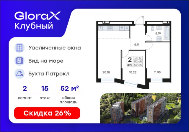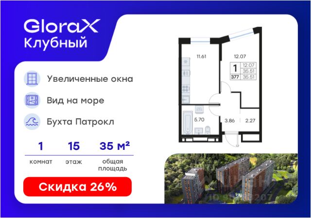 Продается квартира-студия на 15-м этаже в квартале GloraX Клубный. GloraX Клубный - уникальный видовой проект с выделяющейся архитектурой в развитом районе Владивостока. Общая площадь лота составляет 31,14 кв. м, из которых 13,45 кв. м отведено под жилую и 9,00 кв. м под кухонную зону. Номер квартиры - 185.