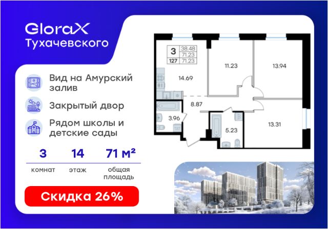 Продается 3-комн. квартира на 14-м этаже в жилом комплексе GloraX Тухачевского — современном проекте нового формата в престижном районе Владивостока. Общая площадь лота составляет 71,23 кв. м, из которых 38,48 кв. м отведено под жилую и 14,69 кв. м под кухонную зону. Номер квартиры - 127. Преимущества квартиры: трехкомнатная квартира; вид на море; высокий этаж; угловая; 2 санузла. Преимущества проекта: • Панорамный вид на Амурский залив и зелёные сопки • Удачное расположение и транспортная доступность: Первореченский район, 20 минут до центра города • Закрытая охраняемая территория с доступом только для жителей • Эксклюзивное благоустройство: продуманное зонирование, игровые и спортивные площадки, арт-инсталляция, Тайный сад • Безбарьерная среда, видеонаблюдений, Wi-Fi на территории • Премиальный дизайн входных групп реcепшн и лаунж-зоной • Лапомойки, колясочные и туалеты на первом этаже • Подземный паркинг на 449 машиномест с доступом на лифте с жилых этажей • Индивидуальные кладовые на цокольном этаже от 2 до 10 м2 GloraX Тухачевского — это городское пространство нового формата, которое позволяет современным горожанам находить все необходимые атрибуты комфортной жизни внутри своего жилого комплекса. Весь комплекс спроектирован так, чтобы жить здесь было удобно и безопасно: светлые лаунж-зоны и ресепшн на входах в жилые корпуса, эксклюзивный дизайн мест общего пользования и придомовой территории, круглосуточная охрана, видеонаблюдение и даже детский сад в одном из корпусов все, что необходимо современному городскому жителю. GloraX Тухачевского находится в одном из самых престижных районов города с хорошей, давно сформировавшейся инфраструктурой и отличной транспортной доступностью. Отсюда легко добраться до центра города, других районов и даже пригорода как на собственном транспорте, так и на общественном. Квартал имеет прямой выезд на ул. Тухачевского, а рядом с комплексом расположена автобусная остановка на несколько маршрутов. Проект состоит из 3 монолитных корпусов, объединенных единым стилобатом. В комплексе предусмотрены: подземный паркинг с лифтом на жилые этажи, кладовые для хранения, благоустроенный двор без машин, детские и спортивные площадки, зоны для отдыха и прогулок. Эксклюзивный проект благоустройства территории разработан одной из лучших студий ландшафтного дизайна DEREVOPARK с фокусом на комфорт и удобство для всех жителей комплекса. Вся необходимая инфраструктура — магазины, школы, детские сады, остановки общественного транспорта — находится рядом. Узнайте подробности и подберите свою квартиру в GloraX Тухачевского — в отделе продаж уже сегодня. Действуют скидки при определенных условиях покупки. Узнайте подробности в Отделе продаж.