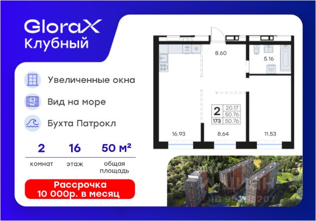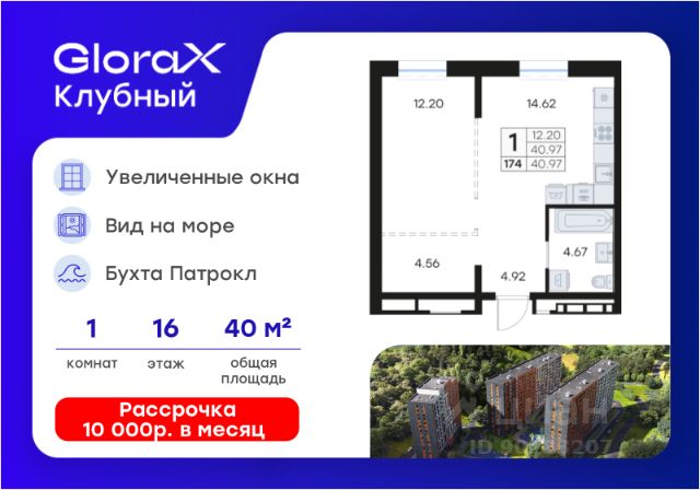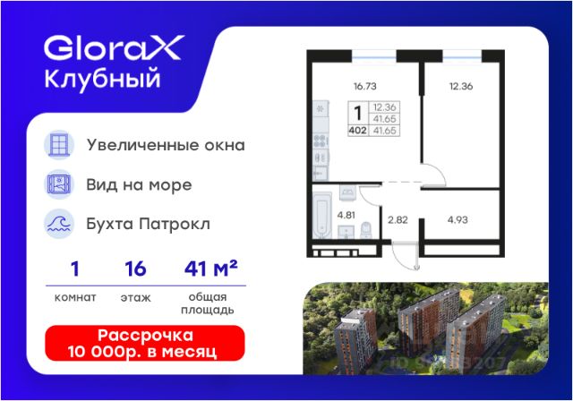 Продается 1-комн. квартира на 16-м этаже в квартале GloraX Клубный. GloraX Клубный - уникальный видовой проект с выделяющейся архитектурой в развитом районе Владивостока. Общая площадь лота составляет 44,41 кв. м, из которых 15,41 кв. м отведено под жилую и 16,07 кв. м под кухонную зону. Номер квартиры - 412. Преимущества квартиры: евро-двухкомнатная квартира; высокий этаж; гардеробная. Преимущества проекта: • Квартиры с панорамными видами на бухту Патрокл, маяк Басаргина и остров Русский • Планировочные решения под любой жизненный сценарий от 23 до 67 м² • Гардеробные комнаты, увеличенные панорамные окна, просторные кухни-гостиные • Эксклюзивное благоустройство: продуманное зонирование, игровые и спортивные площадки, площадка для стритбола, амфитеатр • Премиальный дизайн входных групп с лаунж-зоной • Безбарьерная среда, закрытая территория, видеонаблюдение • Лапомойки, колясочные и туалеты на первом этаже • Двухуровневый подземный паркинг на 350 машино-мест с лифтом на жилые этажи • Келлеры на цокольном этаже для хранения сезонных вещей с доступом на лифте • Современный ландшафтный дизайн комплекса от DEREVOPARK GloraX Клубный заповедник в черте мегаполиса. Комплекс тщательно продуман для максимального удобства и обеспечения безопасности его жителей. Квартал расположен в одном из самых современных развивающихся районов города: совсем рядом раскинулась живописная бухта Патрокл, где можно прогуляться по облагороженной пешеходной набережной, заглянуть на пляж или в школу серфинга. Комплекс имеет прекрасную транспортную доступность: рядом проходит объездная трасса СеданкаПатрокл, а до центар можно доехать всего за 15 минут. Проект включает 3 монолитных корпуса, каждый из которых спроектирован с акцентом на комфорт, безопасность и современный образ жизни рядом с уникальной природой. Общий двор создает приватную территорию для житей комплекса. В комплексе предусмотрен двухуровневый подземный паркинг на 350 машино-мест с доступом прямо с жилых этажей. Паркинг оборудован современными системами видеонаблюдения, контроля въезда-выезда и пожаротушения. На цокольном этаже размещаются келлеры для хранения сезонных и габаритных вещей. Доступ к кладовым на лифте с жилых этажей. Современный ландшафтный дизайн жилого комплекса GloraX Клубный создан ведущей российской студией DEREVOPARK. Во дворе для детей всех возрастов предусмотрены различные игровые площадки с лазалками, батутами, качелями и песочницей. В центре расположен специальный "зеленый остров", где взрослые могут отдохнуть на качелях и гамаках в тени больших деревьев. Для любителей спорта предусмотрены две специальные спортивные площадки для настольного тенниса и стритбола — для зрителей тоже найдется место! А еще на территории комплекса будет дорожка для роллеров и любителей покататься на велосипеде, самокате или скейте. В шаговой доступности располагаются все необходимые объекты социальной и коммерческой инфраструктуры. Ц