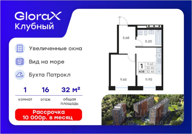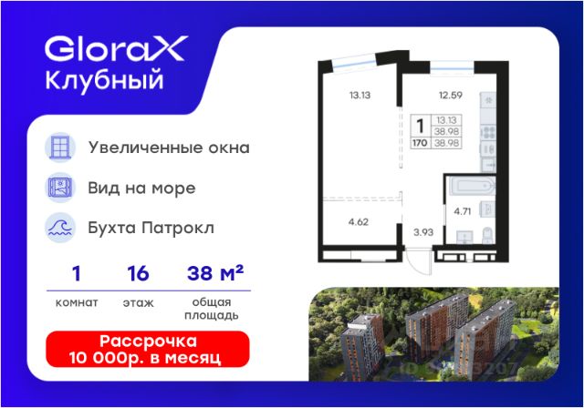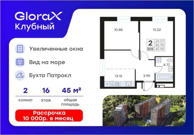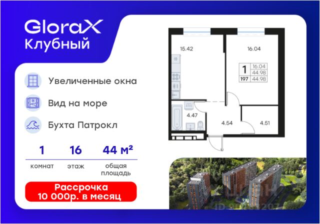 Продается 1-комн. квартира на 16-м этаже в квартале GloraX Клубный. GloraX Клубный - уникальный видовой проект с выделяющейся архитектурой в развитом районе Владивостока. Общая площадь лота составляет 44,41 кв. м, из которых 15,41 кв. м отведено под жилую и 16,07 кв. м под кухонную зону. Номер квартиры - 412. Преимущества квартиры: евро-двухкомнатная квартира; высокий этаж; гардеробная. Преимущества проекта: • Квартиры с панорамными видами на бухту Патрокл, маяк Басаргина и остров Русский • Планировочные решения под любой жизненный сценарий от 23 до 67 м² • Гардеробные комнаты, увеличенные панорамные окна, просторные кухни-гостиные • Эксклюзивное благоустройство: продуманное зонирование, игровые и спортивные площадки, площадка для стритбола, амфитеатр • Премиальный дизайн входных групп с лаунж-зоной • Безбарьерная среда, закрытая территория, видеонаблюдение • Лапомойки, колясочные и туалеты на первом этаже • Двухуровневый подземный паркинг на 350 машино-мест с лифтом на жилые этажи • Келлеры на цокольном этаже для хранения сезонных вещей с доступом на лифте • Современный ландшафтный дизайн комплекса от DEREVOPARK GloraX Клубный заповедник в черте мегаполиса. Комплекс тщательно продуман для максимального удобства и обеспечения безопасности его жителей. Квартал расположен в одном из самых современных развивающихся районов города: совсем рядом раскинулась живописная бухта Патрокл, где можно прогуляться по облагороженной пешеходной набережной, заглянуть на пляж или в школу серфинга. Комплекс имеет прекрасную транспортную доступность: рядом проходит объездная трасса СеданкаПатрокл, а до центар можно доехать всего за 15 минут. Проект включает 3 монолитных корпуса, каждый из которых спроектирован с акцентом на комфорт, безопасность и современный образ жизни рядом с уникальной природой. Общий двор создает приватную территорию для житей комплекса. В комплексе предусмотрен двухуровневый подземный паркинг на 350 машино-мест с доступом прямо с жилых этажей. Паркинг оборудован современными системами видеонаблюдения, контроля въезда-выезда и пожаротушения. На цокольном этаже размещаются келлеры для хранения сезонных и габаритных вещей. Доступ к кладовым на лифте с жилых этажей. Современный ландшафтный дизайн жилого комплекса GloraX Клубный создан ведущей российской студией DEREVOPARK. Во дворе для детей всех возрастов предусмотрены различные игровые площадки с лазалками, батутами, качелями и песочницей. В центре расположен специальный "зеленый остров", где взрослые могут отдохнуть на качелях и гамаках в тени больших деревьев. Для любителей спорта предусмотрены две специальные спортивные площадки для настольного тенниса и стритбола — для зрителей тоже найдется место! А еще на территории комплекса будет дорожка для роллеров и любителей покататься на велосипеде, самокате или скейте. В шаговой доступности располагаются все необходимые объекты социальной и коммерческой инфраструктуры. Ц
