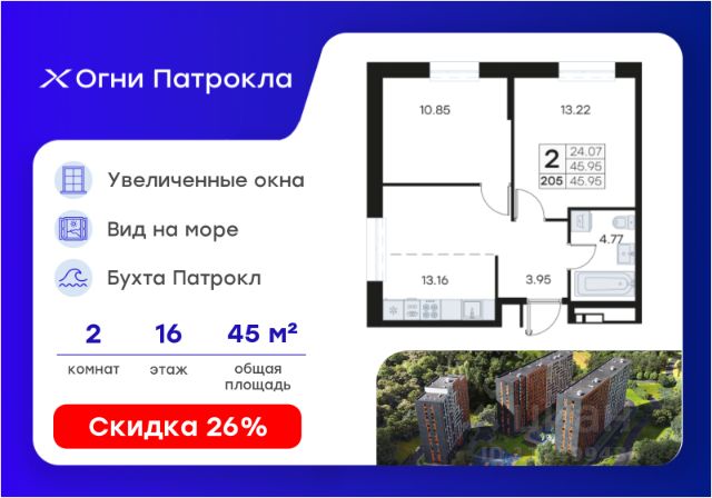 Продается 1-комн. квартира на 16-м этаже в проекте Огни Патрокла от GloraX. Огни Патрокла - уникальный видовой проект с выделяющейся архитектурой в развитом районе Владивостока. Общая площадь лота составляет 38,56 кв. м, из которых 11,09 кв. м отведено под жилую и 11,82 кв. м под кухонную зону. Номер квартиры - 171.