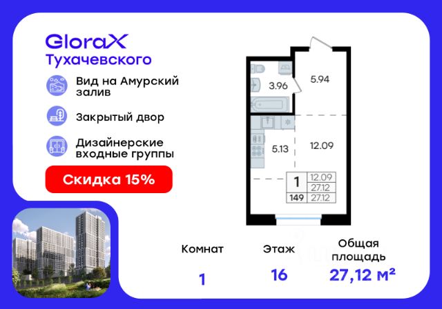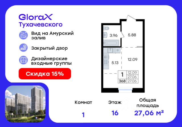 Продается квартира-студия на 16-м этаже в жилом комплексе GloraX Тухачевского — современном проекте нового формата в престижном районе Владивостока. Общая площадь лота составляет 27,06 кв. м, из которых 12,09 кв. м отведено под жилую и 5,13 кв. м под кухонную зону. Номер квартиры - 368. Преимущества квартиры: студия; высокий этаж. Преимущества проекта: • Панорамный вид на Амурский залив и зелёные сопки • Удачное расположение и транспортная доступность: Первореченский район, 20 минут до центра города • Закрытая охраняемая территория с доступом только для жителей • Эксклюзивное благоустройство: продуманное зонирование, игровые и спортивные площадки, арт-инсталляция, Тайный сад • Безбарьерная среда, видеонаблюдений, Wi-Fi на территории • Премиальный дизайн входных групп реcепшн и лаунж-зоной • Лапомойки, колясочные и туалеты на первом этаже • Подземный паркинг на 449 машиномест с доступом на лифте с жилых этажей • Индивидуальные кладовые на цокольном этаже от 2 до 10 м2 GloraX Тухачевского — это городское пространство нового формата, которое позволяет современным горожанам находить все необходимые атрибуты комфортной жизни внутри своего жилого комплекса. Весь комплекс спроектирован так, чтобы жить здесь было удобно и безопасно: светлые лаунж-зоны и ресепшн на входах в жилые корпуса, эксклюзивный дизайн мест общего пользования и придомовой территории, круглосуточная охрана, видеонаблюдение и даже детский сад в одном из корпусов все, что необходимо современному городскому жителю. GloraX Тухачевского находится в одном из самых престижных районов города с хорошей, давно сформировавшейся инфраструктурой и отличной транспортной доступностью. Отсюда легко добраться до центра города, других районов и даже пригорода как на собственном транспорте, так и на общественном. Квартал имеет прямой выезд на ул. Тухачевского, а рядом с комплексом расположена автобусная остановка на несколько маршрутов. Проект состоит из 3 монолитных корпусов, объединенных единым стилобатом. В комплексе предусмотрены: подземный паркинг с лифтом на жилые этажи, кладовые для хранения, благоустроенный двор без машин, детские и спортивные площадки, зоны для отдыха и прогулок. Эксклюзивный проект благоустройства территории разработан одной из лучших студий ландшафтного дизайна DEREVOPARK с фокусом на комфорт и удобство для всех жителей комплекса. Вся необходимая инфраструктура — магазины, школы, детские сады, остановки общественного транспорта — находится рядом. Узнайте подробности и подберите свою квартиру в GloraX Тухачевского — в отделе продаж уже сегодня. Цена указана при 100% оплате или стандартной ипотеке. Узнайте подробности в Отделе продаж.