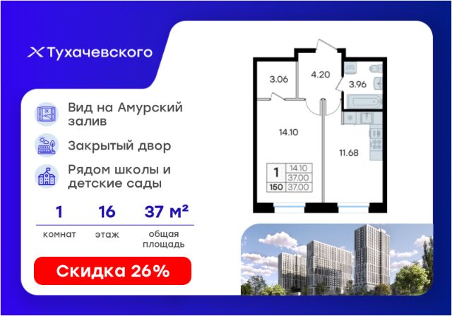 Продается 1-комн. квартира на 16-м этаже в жилом комплексе Тухачевского от GloraX — современном проекте нового формата в престижном районе Владивостока. Общая площадь лота составляет 37,72 кв. м, из которых 14,10 кв. м отведено под жилую и 11,68 кв. м под кухонную зону. Номер квартиры - 371.