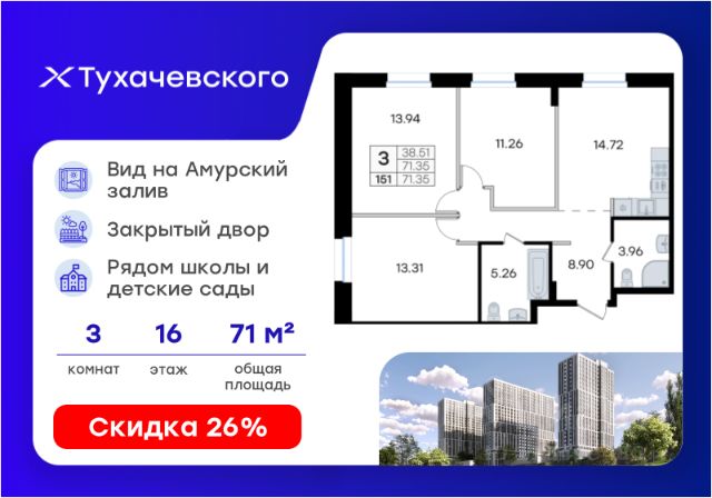 Продается 1-комн. квартира на 16-м этаже в жилом комплексе Тухачевского от GloraX — современном проекте нового формата в престижном районе Владивостока. Общая площадь лота составляет 37,00 кв. м, из которых 14,10 кв. м отведено под жилую и 11,68 кв. м под кухонную зону. Номер квартиры - 150.