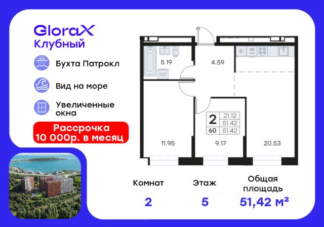 Продается 2-комн. квартира на 5-м этаже в квартале GloraX Клубный. GloraX Клубный - уникальный видовой проект с выделяющейся архитектурой в развитом районе Владивостока. Общая площадь лота составляет 51,58 кв. м, из которых 20,61 кв. м отведено под жилую и 20,68 кв. м под кухонную зону. Номер квартиры - 264. Преимущества квартиры: евро-трехкомнатная квартира. Преимущества проекта: • Квартиры с панорамными видами на бухту Патрокл, маяк Басаргина и остров Русский • Планировочные решения под любой жизненный сценарий от 23 до 67 м² • Гардеробные комнаты, увеличенные панорамные окна, просторные кухни-гостиные • Эксклюзивное благоустройство: продуманное зонирование, игровые и спортивные площадки, площадка для стритбола, амфитеатр • Премиальный дизайн входных групп с лаунж-зоной • Безбарьерная среда, закрытая территория, видеонаблюдение • Лапомойки, колясочные и туалеты на первом этаже • Двухуровневый подземный паркинг на 350 машино-мест с лифтом на жилые этажи • Келлеры на цокольном этаже для хранения сезонных вещей с доступом на лифте • Современный ландшафтный дизайн комплекса от DEREVOPARK GloraX Клубный заповедник в черте мегаполиса. Комплекс тщательно продуман для максимального удобства и обеспечения безопасности его жителей. Квартал расположен в одном из самых современных развивающихся районов города: совсем рядом раскинулась живописная бухта Патрокл, где можно прогуляться по облагороженной пешеходной набережной, заглянуть на пляж или в школу серфинга. Комплекс имеет прекрасную транспортную доступность: рядом проходит объездная трасса СеданкаПатрокл, а до центар можно доехать всего за 15 минут. Проект включает 3 монолитных корпуса, каждый из которых спроектирован с акцентом на комфорт, безопасность и современный образ жизни рядом с уникальной природой. Общий двор создает приватную территорию для житей комплекса. В комплексе предусмотрен двухуровневый подземный паркинг на 350 машино-мест с доступом прямо с жилых этажей. Паркинг оборудован современными системами видеонаблюдения, контроля въезда-выезда и пожаротушения. На цокольном этаже размещаются келлеры для хранения сезонных и габаритных вещей. Доступ к кладовым на лифте с жилых этажей. Современный ландшафтный дизайн жилого комплекса GloraX Клубный создан ведущей российской студией DEREVOPARK. Во дворе для детей всех возрастов предусмотрены различные игровые площадки с лазалками, батутами, качелями и песочницей. В центре расположен специальный "зеленый остров", где взрослые могут отдохнуть на качелях и гамаках в тени больших деревьев. Для любителей спорта предусмотрены две специальные спортивные площадки для настольного тенниса и стритбола — для зрителей тоже найдется место! А еще на территории комплекса будет дорожка для роллеров и любителей покататься на велосипеде, самокате или скейте. В шаговой доступности располагаются все необходимые объекты социальной и коммерческой инфраструктуры. Цена указана при 100% оплате