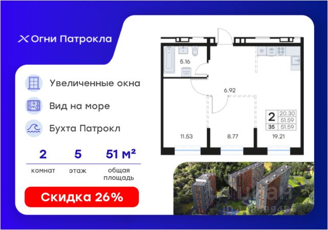 DNV-05-2.2-05-004-088 Светлая уютная студия с большим санузлом и предчистовой отделкой в жилом комплексе "ДОМ на Востоке". Общая площадь 26,7 м2. Срок сдачи 1 кв. 2027 г. Монолитный дом. "ДОМ на Востоке" жилой квартал с авторской архитектурой от известного бюро KAMEN, благоустроенной территорией и собственной развитой инфраструктурой. Это флагманский проект от государственного застройщика ДОМ.РФ Девелопмент, расположенного в сердце живописной бухты Патрокл. Проект находится в перспективном, быстроразвивающемся районе города со всей инфраструктурой на берегу залива. Всего 8 минут пешком и вы на Леопардовой набережной совершаете променад или любуетесь завораживающими закатами и рассветами. До центра города и крупных торговых центров легко добраться за 20 минут на автомобиле. Преимущества лота - Эргономичная планировка - Высокий потолок 2,9 м в чистоте - Большой совмещенный санузел 4,9 м2 - Корзина для кондиционера - Ниша для встроенного шкафа Отделка: В квартире будет выполнена предчистовая отделка. - Возведены перегородки из керамзита-цементных блоков - Оштукатурены стены - Выполнена стяжка пола - Произведена разводка трубопроводов, электричества, вентиляции и кондиционирования. Разводка отопления осуществляется внутри стяжки (горизонтальная), выводы под радиаторы выведены из стены. - Установлены радиаторы с терморегулятором - Выполнена шумоизоляция по полу - Установлены двухкамерные стеклопакеты и металлическая входная дверь - Заведен интернет кабель до слаботочного щита в квартире - Проведены коммуникации под установку кондиционера К моменту выдачи ключей все шумные работы будут завершены. Вам останется самая приятная часть ремонта выбор покрытия стен и пола, сантехники, мебели и аксессуаров. Инфраструктура На первых этажах домов будет все необходимое для жизни: магазины, кафе, аптеки, салоны красоты и многое другое. А для семей с детьми предусмотрены детские сады, безопасные игровые площадки и игровые комнаты. Паркинг: подземный отапливаемый с видеонаблюдением Для удобства жителей комплекса предусмотрен теплый паркинг в доме. Теперь не придется искать место для парковки, а также чистить автомобиль от снега или прогревать его в холодное время года. В паркинге также расположены кладовые помещения для хранения сезонных вещей и спортивного инвентаря. Условия покупки Продажа от надёжного государственного застройщика ДОМ.РФ Девелопмент с использованием эскроу-счетов. 100% оплата или ипотека. Сейчас действуют особые предложения по льготной ипотеке на период строительства.