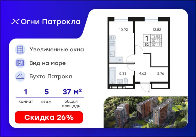 Продается 1-комн. квартира на 5-м этаже в проекте Огни Патрокла от GloraX. Огни Патрокла - уникальный видовой проект с выделяющейся архитектурой в развитом районе Владивостока. Общая площадь лота составляет 38,97 кв. м, из которых 13,13 кв. м отведено под жилую и 13,84 кв. м под кухонную зону. Номер квартиры - 27.