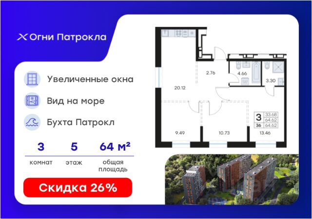 DNV-05-2.2-05-004-088 Светлая уютная студия с большим санузлом и предчистовой отделкой в жилом комплексе "ДОМ на Востоке". Общая площадь 26,7 м2. Срок сдачи 1 кв. 2027 г. Монолитный дом. "ДОМ на Востоке" жилой квартал с авторской архитектурой от известного бюро KAMEN, благоустроенной территорией и собственной развитой инфраструктурой. Это флагманский проект от государственного застройщика ДОМ.РФ Девелопмент, расположенного в сердце живописной бухты Патрокл. Проект находится в перспективном, быстроразвивающемся районе города со всей инфраструктурой на берегу залива. Всего 8 минут пешком и вы на Леопардовой набережной совершаете променад или любуетесь завораживающими закатами и рассветами. До центра города и крупных торговых центров легко добраться за 20 минут на автомобиле. Преимущества лота - Эргономичная планировка - Высокий потолок 2,9 м в чистоте - Большой совмещенный санузел 4,9 м2 - Корзина для кондиционера - Ниша для встроенного шкафа Отделка: В квартире будет выполнена предчистовая отделка. - Возведены перегородки из керамзита-цементных блоков - Оштукатурены стены - Выполнена стяжка пола - Произведена разводка трубопроводов, электричества, вентиляции и кондиционирования. Разводка отопления осуществляется внутри стяжки (горизонтальная), выводы под радиаторы выведены из стены. - Установлены радиаторы с терморегулятором - Выполнена шумоизоляция по полу - Установлены двухкамерные стеклопакеты и металлическая входная дверь - Заведен интернет кабель до слаботочного щита в квартире - Проведены коммуникации под установку кондиционера К моменту выдачи ключей все шумные работы будут завершены. Вам останется самая приятная часть ремонта выбор покрытия стен и пола, сантехники, мебели и аксессуаров. Инфраструктура На первых этажах домов будет все необходимое для жизни: магазины, кафе, аптеки, салоны красоты и многое другое. А для семей с детьми предусмотрены детские сады, безопасные игровые площадки и игровые комнаты. Паркинг: подземный отапливаемый с видеонаблюдением Для удобства жителей комплекса предусмотрен теплый паркинг в доме. Теперь не придется искать место для парковки, а также чистить автомобиль от снега или прогревать его в холодное время года. В паркинге также расположены кладовые помещения для хранения сезонных вещей и спортивного инвентаря. Условия покупки Продажа от надёжного государственного застройщика ДОМ.РФ Девелопмент с использованием эскроу-счетов. 100% оплата или ипотека. Сейчас действуют особые предложения по льготной ипотеке на период строительства.
