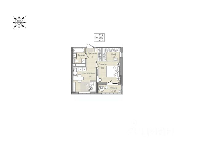 Уютное пространство для самостоятельной жизни Просторная прихожая 4,3 кв.м Кухня-столовая 14,4 кв.м место для ваших кулинарных экспериментов Спальня 11,2 кв.м с выходом на лоджию, где можно наслаждаться свежим воздухом и красивым видом на окружающий пейзаж Гардеробная 5 кв.м в спальне для хранения вещей и порядка в квартире Ванная 4,3 кв.м с местом под стиральную машину