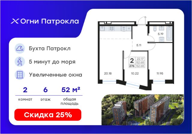 DNV-05-03-06-002-160 Просторная 2-комнатная квартира классического формата с большой кухней и предчистовой отделкой в жилом комплексе "ДОМ на Востоке". Общая площадь 60,3 м2. Срок сдачи 1 кв. 2027 г. Монолитный дом. "ДОМ на Востоке" жилой квартал с авторской архитектурой от известного бюро KAMEN, благоустроенной территорией и собственной развитой инфраструктурой. Это флагманский проект от государственного застройщика ДОМ.РФ Девелопмент, расположенного в сердце живописной бухты Патрокл. Проект находится в перспективном, быстроразвивающемся районе города со всей инфраструктурой на берегу залива. Всего 8 минут пешком и вы на Леопардовой набережной совершаете променад или любуетесь завораживающими закатами и рассветами. До центра города и крупных торговых центров легко добраться за 20 минут на автомобиле. Преимущества лота - Высокий потолок 2,9 м в чистоте - Два санузла - Просторная кухня 12,8 м2 - Повышенная инсоляция 4 окна в гостиной - 2 корзины для кондиционера Отделка: В квартире будет выполнена предчистовая отделка. - Возведены перегородки из керамзита-цементных блоков - Оштукатурены стены - Выполнена стяжка пола - Произведена разводка трубопроводов, электричества, вентиляции и кондиционирования. Разводка отопления осуществляется внутри стяжки (горизонтальная), выводы под радиаторы выведены из стены. - Установлены радиаторы с терморегулятором - Выполнена шумоизоляция по полу - Установлены двухкамерные стеклопакеты и металлическая входная дверь - Заведен интернет кабель до слаботочного щита в квартире - Проведены коммуникации под установку кондиционера К моменту выдачи ключей все шумные работы будут завершены. Вам останется самая приятная часть ремонта выбор покрытия стен и пола, сантехники, мебели и аксессуаров. Инфраструктура На первых этажах домов будет все необходимое для жизни: магазины, кафе, аптеки, салоны красоты и многое другое. А для семей с детьми предусмотрены детские сады, безопасные игровые площадки и игровые комнаты. Паркинг: подземный отапливаемый с видеонаблюдением Для удобства жителей комплекса предусмотрен теплый паркинг в доме. Теперь не придется искать место для парковки, а также чистить автомобиль от снега или прогревать его в холодное время года. В паркинге также расположены кладовые помещения для хранения сезонных вещей и спортивного инвентаря. Условия покупки Продажа от надёжного государственного застройщика ДОМ.РФ Девелопмент с использованием эскроу-счетов. 100% оплата или ипотека. Сейчас действуют особые предложения по льготной ипотеке на период строительства.