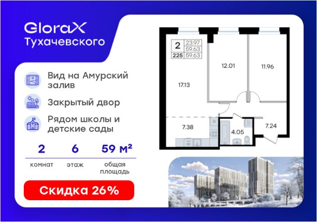 Продается 3-комн. квартира на 6-м этаже в жилом комплексе GloraX Тухачевского — современном проекте нового формата в престижном районе Владивостока. Общая площадь лота составляет 62,81 кв. м, из которых 33,17 кв. м отведено под жилую и 13,84 кв. м под кухонную зону. Номер квартиры - 228.