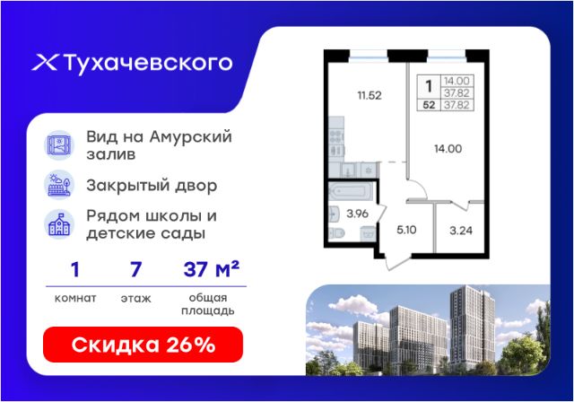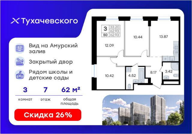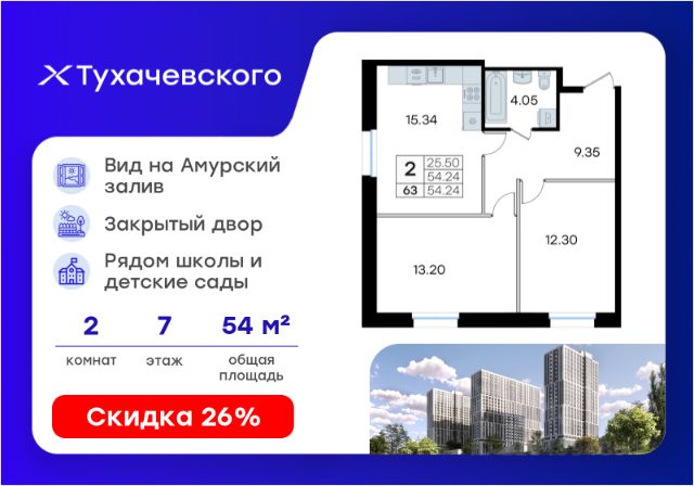 Продаётся 2-комн. квартира площадью 50 кв.м на 7 этаже 25 этажного дома (Корпус 3, Секция 1) проекта ПИК Снежный парк. Светлый просторный подъезд на уровне земли, функциональная планировка, большие окна, предчистовая отделка. Жилой квартал "Снежный парк" возводится в развитом микрорайоне Владивостока - Снеговой Пади. Рядом уже есть всё для комфортной жизни: 2 школы, детская и взрослая поликлиники, торговый центр и магазины. Проект будет состоять из 7 корпусов, высота которых от 24 до 29 этажей. Благодаря низкой плотности застройки жители будут чувствовать себя комфортно. За счёт переменной этажности в квартиры будет попадать ещё больше естественного света. Из окон последних этажей будет открываться панорамный вид на Амурский залив и лес. В квартирах предусмотрены большие окна, застеклённые балконы и лоджии - будет светло и уютно даже зимой. В жилом квартале появится уникальное общественное пространство с пешеходным бульваром и зонами для отдыха. На первых этажах откроются кафе, магазины и полезные сервисы, куда можно спуститься за горячим кофе или свежеиспечённым хлебом. Из каждого дома будет выход в уютный двор-парк с современными детскими и спортивными площадками. Здесь мы посадим цветы и деревья: будет приятно отдыхать или почитать книгу. Артикул 785679 (Застройщик ООО "СЗ ФОРМУЛА-ДВ")