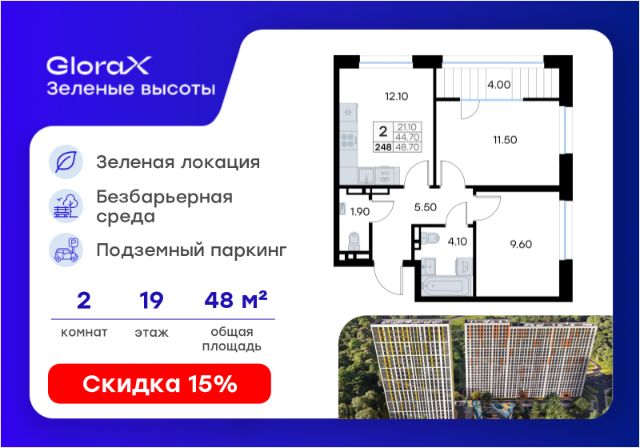 Продается 2-комн. квартира на 19-м этаже в жилом квартале GloraX Зелёные высоты — проекте в тихой зелёной локации. Общая площадь квартиры 48,70 кв. м, из которых 21,10 кв. м включая 21,10 кв. м жилого пространства и 12,10 кв. м кухни. Номер квартиры - 248. Преимущества квартиры: угловая 2 к.кв.; вид на лесопарк; лоджия. Преимущества проекта: • Идеальное сочетание городской и загородной жизни • Сдаем в 2026 году • Уютный зелёный район с развитой инфраструктурой • Великолепные виды на Вечнозеленый сквер и лесопарк на 150 Га • Видеонаблюдение, IP-домофон, Wi-Fi на территории, • Дизайнерские входные группы • Безбарьерная среда, колясочные, туалеты на 1 этаже, лапомойки • Эксклюзивное благоустройство территории • Подземный паркинг на 235 машино-мест с лифтом на жилые этажи • Индивидуальные кладовые от 3 до 7 кв. м • Черновая отделка для реализации любых дизайнерских идей GloraX Зелёные высоты — современный жилой проект, сочетающий преимущества городской и пригородной жизни. Комплекс тщательно продуман для максимального удобства и обеспечения безопасности жителей. Квартал расположен в зеленом, живописном и активно развивающемся районе Зеленый Угол, вдали от серой массовой застройки. Жители GloraX Зелёные высоты смогут насладждаться прогулками в Вечнозелёном сквере или лесопарке. В непосредственной близости находятся остановки общественного транспорта и автомобильный подъезд со стороны Нейбута. Скоро также появится выездом на трассу Де-Фриз-Седанка, что обеспечит быстрый доступ в любую часть города и пригород. Проект включает 2 корпуса, каждый из которых спроектирован с акцентом на комфорт, безопасность и современный образ жизни. В комплексе предусмотрен подземный паркинг на 235 машиномест с доступом прямо с жилых этажей. Паркинг оборудован современными системами видеонаблюдения, контроля въезда-выезда и пожаротушения. Цокольный этаж здания отведен под индивидуальные кладовые площадью от 3 до 7 квадратных метров, которые можно использовать для хранения сезонных вещей. Доступ к кладовым - на лифте с жилых этажей. Территория жилого квартала благоустроена и включает игровые зоны и спортивные площадки для детей различных возрастных групп, уютные зоны отдыха со скамейками и универсальную воркаут-площадку для активного досуга. В шаговой доступности располагаются все необходимые объекты социальной инфраструктуры. Узнайте больше в отделе продаж — выберите свою квартиру в GloraX Зелёные высоты уже сегодня!