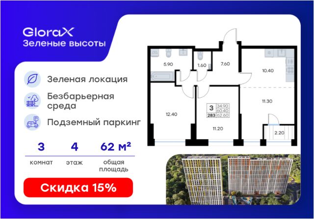 Продается 3-комн. квартира на 4-м этаже в жилом квартале GloraX Зелёные высоты — проекте в тихой зелёной локации. Общая площадь квартиры 62,60 кв. м, из которых 34,90 кв. м включая 34,90 кв. м жилого пространства и 10,40 кв. м кухни. Номер квартиры - 283. Преимущества квартиры: просторная 2 к.кв.; лоджия. Преимущества проекта: • Идеальное сочетание городской и загородной жизни • Сдаем в 2026 году • Уютный зелёный район с развитой инфраструктурой • Великолепные виды на Вечнозеленый сквер и лесопарк на 150 Га • Видеонаблюдение, IP-домофон, Wi-Fi на территории, • Дизайнерские входные группы • Безбарьерная среда, колясочные, туалеты на 1 этаже, лапомойки • Эксклюзивное благоустройство территории • Подземный паркинг на 235 машино-мест с лифтом на жилые этажи • Индивидуальные кладовые от 3 до 7 кв. м • Черновая отделка для реализации любых дизайнерских идей GloraX Зелёные высоты — современный жилой проект, сочетающий преимущества городской и пригородной жизни. Комплекс тщательно продуман для максимального удобства и обеспечения безопасности жителей. Квартал расположен в зеленом, живописном и активно развивающемся районе Зеленый Угол, вдали от серой массовой застройки. Жители GloraX Зелёные высоты смогут насладждаться прогулками в Вечнозелёном сквере или лесопарке. В непосредственной близости находятся остановки общественного транспорта и автомобильный подъезд со стороны Нейбута. Скоро также появится выездом на трассу Де-Фриз-Седанка, что обеспечит быстрый доступ в любую часть города и пригород. Проект включает 2 корпуса, каждый из которых спроектирован с акцентом на комфорт, безопасность и современный образ жизни. В комплексе предусмотрен подземный паркинг на 235 машиномест с доступом прямо с жилых этажей. Паркинг оборудован современными системами видеонаблюдения, контроля въезда-выезда и пожаротушения. Цокольный этаж здания отведен под индивидуальные кладовые площадью от 3 до 7 квадратных метров, которые можно использовать для хранения сезонных вещей. Доступ к кладовым - на лифте с жилых этажей. Территория жилого квартала благоустроена и включает игровые зоны и спортивные площадки для детей различных возрастных групп, уютные зоны отдыха со скамейками и универсальную воркаут-площадку для активного досуга. В шаговой доступности располагаются все необходимые объекты социальной инфраструктуры. Узнайте больше в отделе продаж — выберите свою квартиру в GloraX Зелёные высоты уже сегодня!
