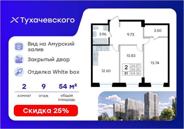 -200 000р. молодожёнам при покупке квартиры, суммируется с другими спецпредложениями! Подробности уточняйте в отделе продаж. ДОМ СДАН! Преимущества: - панорамные виды благодаря эркерам; - увеличенные оконные проемы; - келлеры в стилобате; - панорамные лифты; - широкие коридоры в местах общего пользования; - отапливаемый паркинг; - закрытая территория; - развитая инфраструктура района; - высокая транспортная доступность. Жилой комплекс, расположенный неподалёку от станции Чайка, состоит из двух 23-этажных корпусов с 2-уровневым отапливаемым подземным паркингом, индивидуальными келлерами в стилобате, закрытой придомовой территорией и комплексным видеонаблюдением. Он представляет не что иное, как воплощение комфорта нового времени, грамотно интегрированного в ландшафт естественной природной среды, вдали от шумного центра города. Широкоформатные квартиры свободной планировки формата Smart-vision площадью от 39,56 кв. м до 81,9 кв. м позволяют реализовать любые планировочные решения, а эркерные окна увеличенного размера открывают головокружительный вид на Амурский залив, низководный мост и завораживающий лесной массив. Проектом предусмотрены широкие коридоры мест общего пользования 2,4 м, просторный лифтовой холл площадью 37 кв. м и вестибюль 15,68 кв. м. Панорамные скоростные лифты на внешней стороне фасада дарят ощущение абсолютной свободы, а много солнечного света, проникающего в кабину, и дальний обзор прилегающей местности служат превосходными преимуществами для людей, которые испытывают дискомфорт при пребывании в закрытом пространстве. Инвестиционную привлекательность обеспечивает возможность приобретения коммерческой недвижимости со стабильным потоком клиентов для организации бизнеса или сдачи пространств в аренду. Комплекс расположен в непосредственной близости от главной дорожной развязки "Федеральная трасса Аэропорт Де фриз Шамора Патрокл Центр" (А -370) и объездной дороги "Чапаева Кирова", остановка "Стела" в 5 минутах (500 м) ходьбы, "13 километр" в 5 минутах (450 м), "Академическая" в 9 минутах (800 м), ж/д станция "Чайка" в 15 минутах (1,5 км). Развита социальная инфраструктура микрорайона, поблизости: пляж, медицинская клиника, стоматология, детский сад, школа, почта, торговый центр, фитнес-клуб, центр современного искусства и конноспортивный клуб.