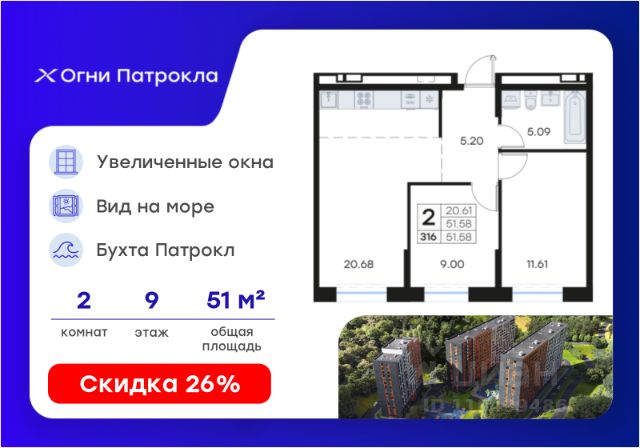DNV-06-01-09-006-048 Современная 1-комнатная квартира классического формата с большой светлой гостиной в жилом комплексе "ДОМ на Востоке". Общая площадь 41,9 м2. Срок сдачи 3 кв. 2027 г. Монолитный дом. "ДОМ на Востоке" жилой квартал с авторской архитектурой от известного бюро KAMEN, благоустроенной территорией и собственной развитой инфраструктурой. Это флагманский проект от государственного застройщика ДОМ.РФ Девелопмент, расположенного в сердце живописной бухты Патрокл. Проект находится в перспективном, быстроразвивающемся районе города со всей инфраструктурой на берегу залива. Всего 8 минут пешком и вы на Леопардовой набережной совершаете променад или любуетесь завораживающими закатами и рассветами. До центра города и крупных торговых центров легко добраться за 20 минут на автомобиле. Преимущества лота - Высокий потолок 2,9 м - Гардеробная комната - Большая кухня - Радиусное остекление панорамные виды - Повышенная инсоляция - 4 окна в кухне-гостиной - 2 корзины для кондиционера Отделка: Квартира сдается в черновой отделке. Инфраструктура На первых этажах домов будет все необходимое для жизни: магазины, кафе, аптеки, салоны красоты и многое другое. А для семей с детьми предусмотрены детские сады, безопасные игровые площадки и игровые комнаты. Паркинг: подземный отапливаемый с видеонаблюдением Для удобства жителей комплекса предусмотрен теплый паркинг в доме. Теперь не придется искать место для парковки, а также чистить автомобиль от снега или прогревать его в холодное время года. В паркинге также расположены кладовые помещения для хранения сезонных вещей и спортивного инвентаря. Условия покупки Продажа от надёжного государственного застройщика ДОМ.РФ Девелопмент с использованием эскроу-счетов. 100% оплата или ипотека. Сейчас действуют особые предложения по льготной ипотеке на период строительства.