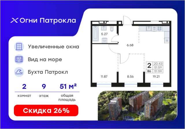 Продается 2-комн. квартира на 9-м этаже в проекте Огни Патрокла от GloraX. Огни Патрокла - уникальный видовой проект с выделяющейся архитектурой в развитом районе Владивостока. Общая площадь лота составляет 51,58 кв. м, из которых 20,61 кв. м отведено под жилую и 20,68 кв. м под кухонную зону. Номер квартиры - 316.