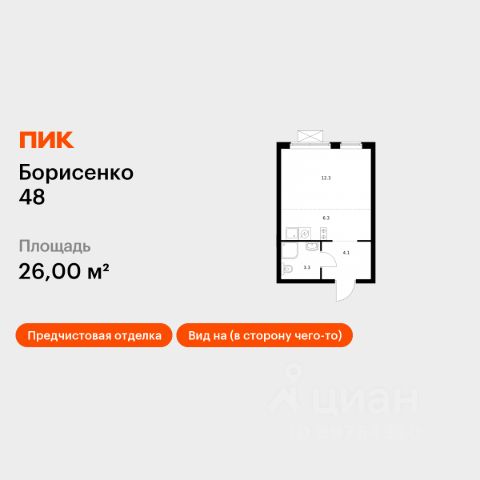 Продаётся квартира-студия площадью 24,1 кв.м на 25 этаже 28 этажного дома (Корпус 2, Секция 2) проекта ПИК Борисенко 48. Светлый просторный подъезд на уровне земли, функциональная планировка, большие окна, предчистовая отделка. "Борисенко 48" - небольшой квартал в Первомайском районе, в 15 минутах пути на автомобиле от центра Владивостока. С верхних этажей откроется живописный вид на город и сопки. В проекте всего четыре дома и подземный паркинг, в который можно будет спуститься на лифте. Высота домов от 17 до 30 этажей - благодаря переменной этажности солнце будет лучше освещать двор и квартиры. На первых этажах откроются пекарни, кафе, магазины и другие сервисы - это удобно, когда внезапно закончится хлеб или захочется побаловать себя горячим кофе. Из каждого дома будет выход в уютный двор-парк - это закрытая территория для отдыха, где растут цветы и деревья, оборудованы детские и спортивные площадки. Рядом с "Борисенко 48" появится также детский сад для 150 малышей. В пешей доступности есть всё необходимое для комфортной жизни: школы, детские сады, поликлиника и магазины. До крупных торговых центров "Калина Молл" и "Луговая", а также супермаркета "Реми" - всего 5 минут на машине. А до озера на Сафонова, которое отлично подходит для прогулок и отдыха, можно дойти пешком за 9 минут. Живописная Леопардовая набережная - в 10 минутах на автомобиле. Из квартала можно будет выехать как на улицу Борисенко, так и на улицу Сафонова. Артикул 923346 (Застройщик ООО "СЗ "Юстина")