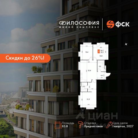 Скидки до 26%! Прямая продажа от застройщика! Жилой Комплекс бизнес-класса. Продаётся 3-к квартира номер 413 общей площадью 85.8 кв.м. на 4-м этаже 10 этажного здания. Предчистовая отделка. Цена с учётом скидки. Особенности квартиры: - Мастер-зона с санузлом и гардеробной. Всё для вашего комфорта и удобства, включая личный санузел и гардероб. - Распашная планировка - отличное сочетание удобства и свободы. - Угловая планировка - больше пространства для ваших идей. - Увеличенное количество окон - дополнительное освещение и свежий воздух. - Панорамное окно (1 и более) - раскрывает просторы вашего дома. - Просторная ванная - место для расслабления и уединения. - Просторная мягкая зона - комфорт и уют для отдыха всей семьи. - Кухня-гостиная - идеальное пространство для встреч с близкими. Квартира с предчистовой отделкой. Вам не придется заниматься черновыми и трудоёмкими работы, а чистовую отделку и дизайн - сделайте на свой вкус. Информация о комплексе: В самом центре Владивостока рождается "Философия" - жилой комплекс бизнес-класса, вдохновлённый идеей гармонии. Семь тематических зданий складываются в единое произведение архитектуры, где каждая деталь продумана для вашего комфорта, вдохновения и покоя. Транспортная доступность: - 15 мин. пешком до Пушкинского театра и музейно-театрального центра на Орлиной сопке - 15 мин. пешком до Набережной Цесаревича - 5-10 мин. на машине до парка Минного городка -