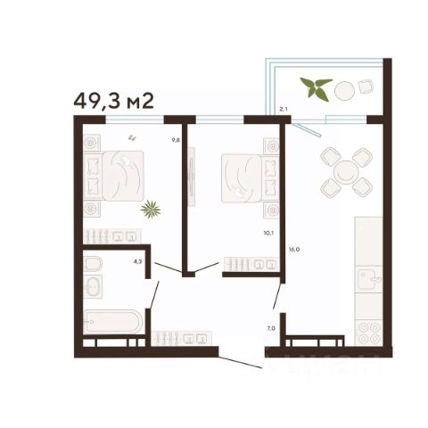 Базовая планировка квартиры - 2 большие комнаты с двумя проходами в каждой. С помощью возведения перегородки можно перепланировать квартиру под нужды любой семьи.