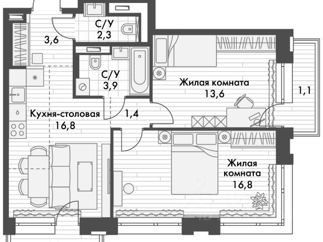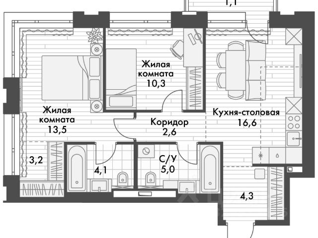 -Кухня совмещенная с гостиной, спальня, комната, детская с 2-мя раздельными кроватями, 2 с/узла
