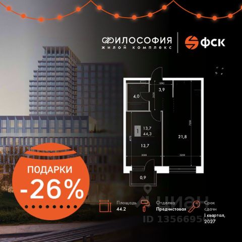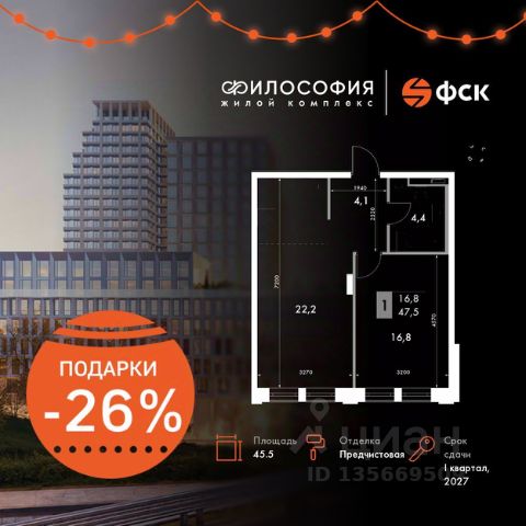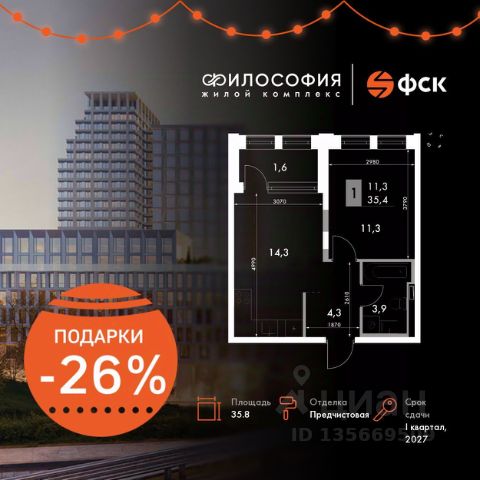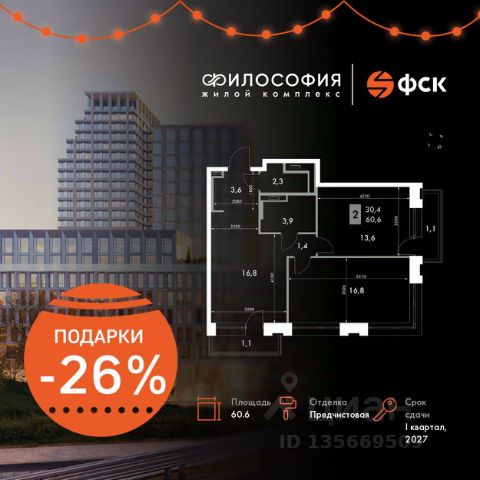 Просторная трёхкомнатная квартира площадью 114,8 квадратных метров на четвёртом этаже первого и единственного небоскреба Элит класса в Сибири и на Дальнем Востоке, высота небоскреба 155,5 м