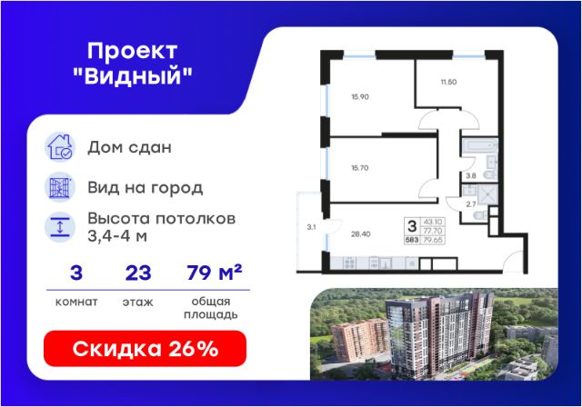 Продается просторная 3-комн. квартира на 23-м этаже в жилом комплексе GloraX Видный — современном проекте комфорт-класса в развитом районе Владивостока. Квартира расположена на высоком этаже и обладает великолепным видом на городской пейзаж. Общая площадь лота составляет 79,42 кв. м, из которых 43,04 кв. м отведено под жилую и 17,14 кв. м под кухонную зону. Просторное жилое пространство с двумя санузлами, позволяет удобно разместить гостиную, две спальни и кухню-столовую. Гибкая планировка позволяет легко адаптировать пространство под индивидуальные потребности семьи. Номер квартиры - 583. Квартира прекрасно подходит для семейного проживания, позволяя насладиться всеми преимуществами большого города и комфортной домашней обстановки. Преимущества проекта: • Дом сдан — ключи можно получить в день оплаты • Современная архитектура и 24 этажа монолитного комфорта • Спокойный район с готовой инфраструктурой и удобной транспортной доступностью • Подземный паркинг на 284 машиноместа с видеонаблюдением и доступом на лифте с жилых этажей • Индивидуальные келлеры от 2,3 до 7,9 м² на подземном уровне • Просторные входные группы с дизайнерской отделкой и помещениями для хранения колясок • Двор без машин: благоустроенная территория, детские и спортивные площадки, зоны отдыха • Коммерческие помещения на первых этажах — магазины, кофейни, пекарни прямо у дома • Авторский ландшафтный проект с освещением, озеленением и зонированием Проект GloraX Видный — это городское пространство нового формата, где каждый элемент продуман для комфорта современных жителей. Комплекс расположен на улице Карбышева — в тихом, но развитом районе Владивостока. В шаговой доступности — детские сады, школы, магазины, кафе, аптеки и остановки общественного транспорта. Удобный выезд на городские магистрали позволяет быстро добраться до центра, автовокзала (5 км), парка Покровского (8 км) и международного аэропорта (45 км). Архитектура жилого дома воплощает современные тенденции градостроительства и отражает стремление к гармонии с окружающей средой. Этот проект представляет собой идеальное сочетание комфорта, безопасности и удобств для полноценной семейной жизни. Узнайте подробности и подберите свою квартиру в GloraX Видный — в отделе продаж уже сегодня. Цена указана при 100% оплате или стандартной ипотеке.