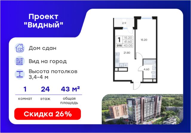 Продается 1-комн. квартира на 24-м этаже в жилом комплексе Видный — современном проекте комфорт-класса в развитом районе Владивостока. Общая площадь лота составляет 43,38 кв. м, из которых 15,46 кв. м отведено под жилую и 15,00 кв. м под кухонную зону. Номер квартиры - 598. Преимущества проекта: • Дом сдан — ключи можно получить в день оплаты • Современная архитектура и 24 этажа монолитного комфорта • Спокойный район с готовой инфраструктурой и удобной транспортной доступностью • Подземный паркинг на 284 машиноместа с видеонаблюдением и доступом на лифте с жилых этажей • Индивидуальные келлеры от 2,3 до 7,9 м² на подземном уровне • Просторные входные группы с дизайнерской отделкой и помещениями для хранения колясок • Двор без машин: благоустроенная территория, детские и спортивные площадки, зоны отдыха • Коммерческие помещения на первых этажах — магазины, кофейни, пекарни прямо у дома • Авторский ландшафтный проект с освещением, озеленением и зонированием Проект Видный — это городское пространство нового формата, где каждый элемент продуман для комфорта современных жителей. Входы на уровне земли, бесшумные скоростные лифты, дизайнерские холлы, келлеры и колясочные — всё для удобной и современной жизни. Комплекс расположен на улице Карбышева — в тихом, но развитом районе Владивостока. В шаговой доступности — детские сады, школы, магазины, кафе, аптеки и остановки общественного транспорта. Удобный выезд на городские магистрали позволяет быстро добраться до центра, автовокзала (5 км), парка Покровского (8 км) и международного аэропорта (45 км). Архитектура проекта сочетает современные решения и высокое качество материалов. Единственный корпус на 24 этажа выполнен по монолитной технологии с акцентом на эстетику и долговечность фасадов. Пространство организовано с учётом потребностей разных жителей — от молодых семей до деловых людей и пенсионеров. Проект благоустройства разработан с упором на безопасность и комфорт: зоны отдыха, спортивные и игровые площадки, ландшафтный дизайн и вечерняя подсветка создают атмосферу уюта и приватности. Узнайте подробности и подберите свою квартиру в GloraX Видный — в отделе продаж уже сегодня. Цена указана при 100% оплате или стандартной ипотеке. Узнайте подробности в Отделе продаж.