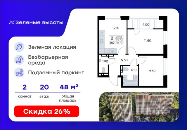 Продается 2-комн. квартира на 20-м этаже в жилом квартале Зелёные высоты от GloraX — проекте в тихой зелёной локации. Общая площадь квартиры 48,70 кв. м, из которых 21,10 кв. м включая 21,10 кв. м жилого пространства и 12,10 кв. м кухни. Номер квартиры - 262.
