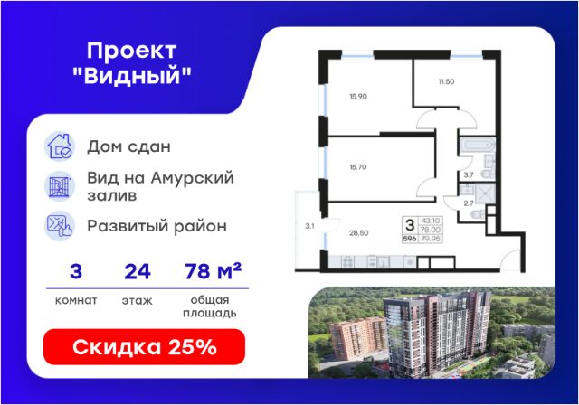Продается просторная 3-комн. квартира на 24-м этаже в жилом комплексе GloraX Видный — современном проекте комфорт-класса в развитом районе Владивостока. Квартира расположена на высоком этаже и обладает великолепным видом на городской пейзаж. Общая площадь лота составляет 79,42 кв. м, из которых 43,04 кв. м отведено под жилую и 17,14 кв. м под кухонную зону. Просторное жилое пространство с двумя санузлами, позволяет удобно разместить гостиную, две спальни и кухню-столовую. Гибкая планировка позволяет легко адаптировать пространство под индивидуальные потребности семьи. Высокие потолки 3,2 метра создают эффект дополнительного объёма, визуально увеличивая пространство. Номер квартиры - 596. Квартира прекрасно подходит для семейного проживания, позволяя насладиться всеми преимуществами большого города и комфортной домашней обстановки. Преимущества проекта: • Дом сдан — ключи можно получить в день оплаты • Современная архитектура и 24 этажа монолитного комфорта • Спокойный район с готовой инфраструктурой и удобной транспортной доступностью • Подземный паркинг на 284 машиноместа с видеонаблюдением и доступом на лифте с жилых этажей • Индивидуальные келлеры от 2,3 до 7,9 м² на подземном уровне • Просторные входные группы с дизайнерской отделкой и помещениями для хранения колясок • Двор без машин: благоустроенная территория, детские и спортивные площадки, зоны отдыха • Коммерческие помещения на первых этажах — магазины, кофейни, пекарни прямо у дома • Авторский ландшафтный проект с освещением, озеленением и зонированием Проект GloraX Видный — это городское пространство нового формата, где каждый элемент продуман для комфорта современных жителей. Комплекс расположен на улице Карбышева — в тихом, но развитом районе Владивостока. В шаговой доступности — детские сады, школы, магазины, кафе, аптеки и остановки общественного транспорта. Удобный выезд на городские магистрали позволяет быстро добраться до центра, автовокзала (5 км), парка Покровского (8 км) и международного аэропорта (45 км). Архитектура жилого дома воплощает современные тенденции градостроительства и отражает стремление к гармонии с окружающей средой. Этот проект представляет собой идеальное сочетание комфорта, безопасности и удобств для полноценной семейной жизни. Узнайте подробности и подберите свою квартиру в GloraX Видный — в отделе продаж уже сегодня. Цена указана при 100% оплате или стандартной ипотеке. Продается квартира в микрорайоне БАМ в городе Владивосток.
